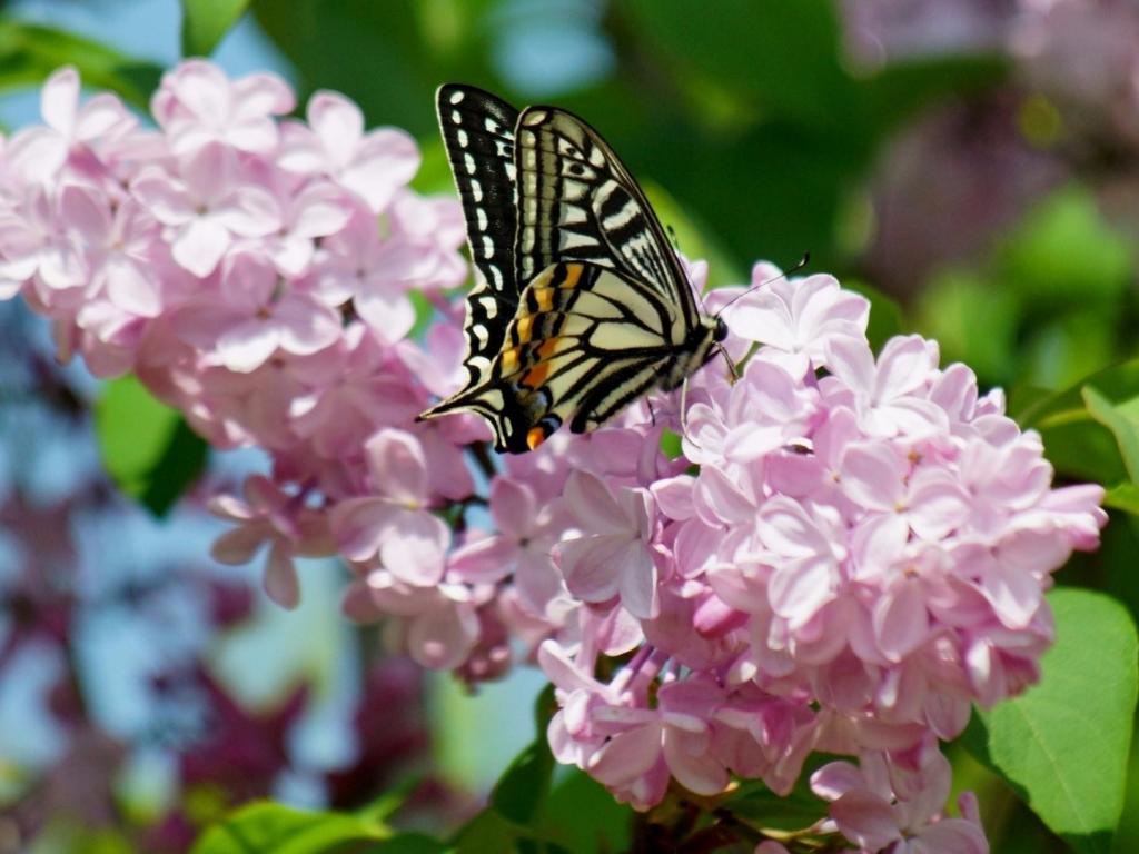 Wallpaper Butterfly machaon on a branch of a pink lilac