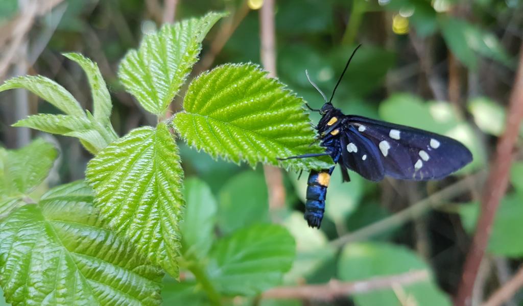 Wallpaper A beautiful black butterfly sits on a green raspberry leaf