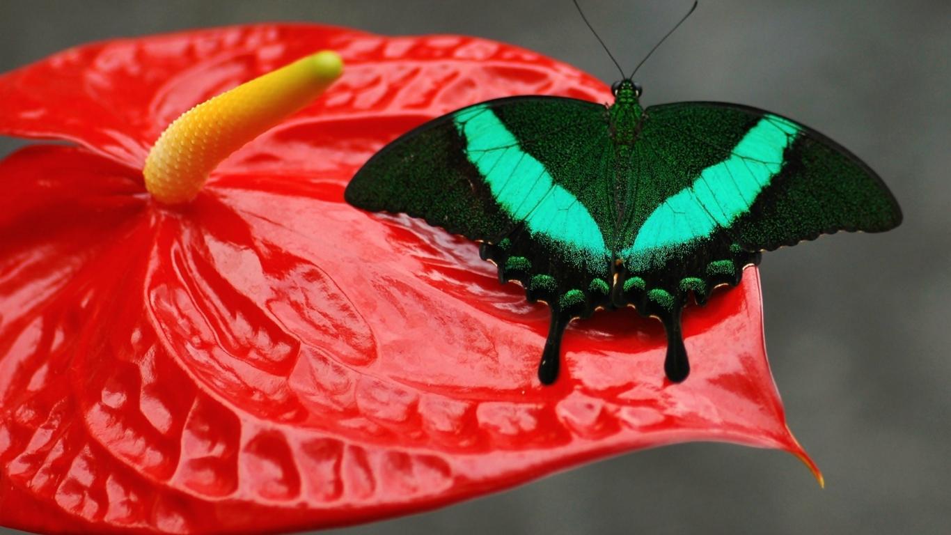 Wallpaper Beautiful green butterfly sitting on a red flower