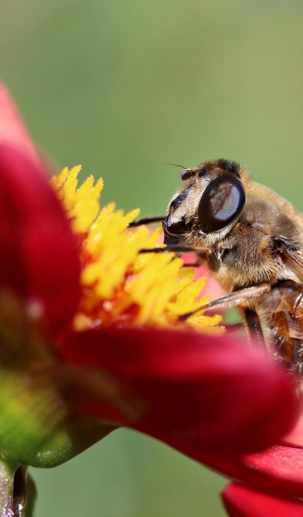Wallpaper The bee sits on a red flower of dahlia, macro photography