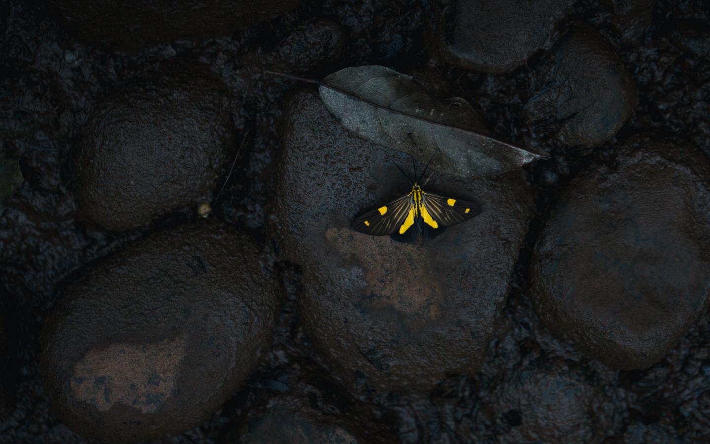 Wallpaper Little butterfly on wet black stones