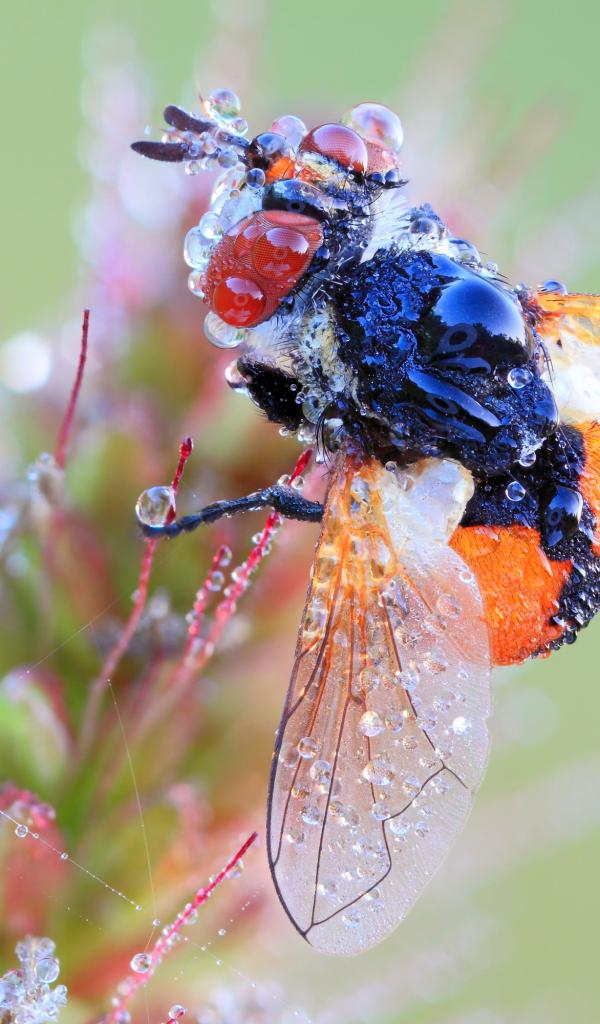 Wallpaper Fly in the drops of dew on a flower macro