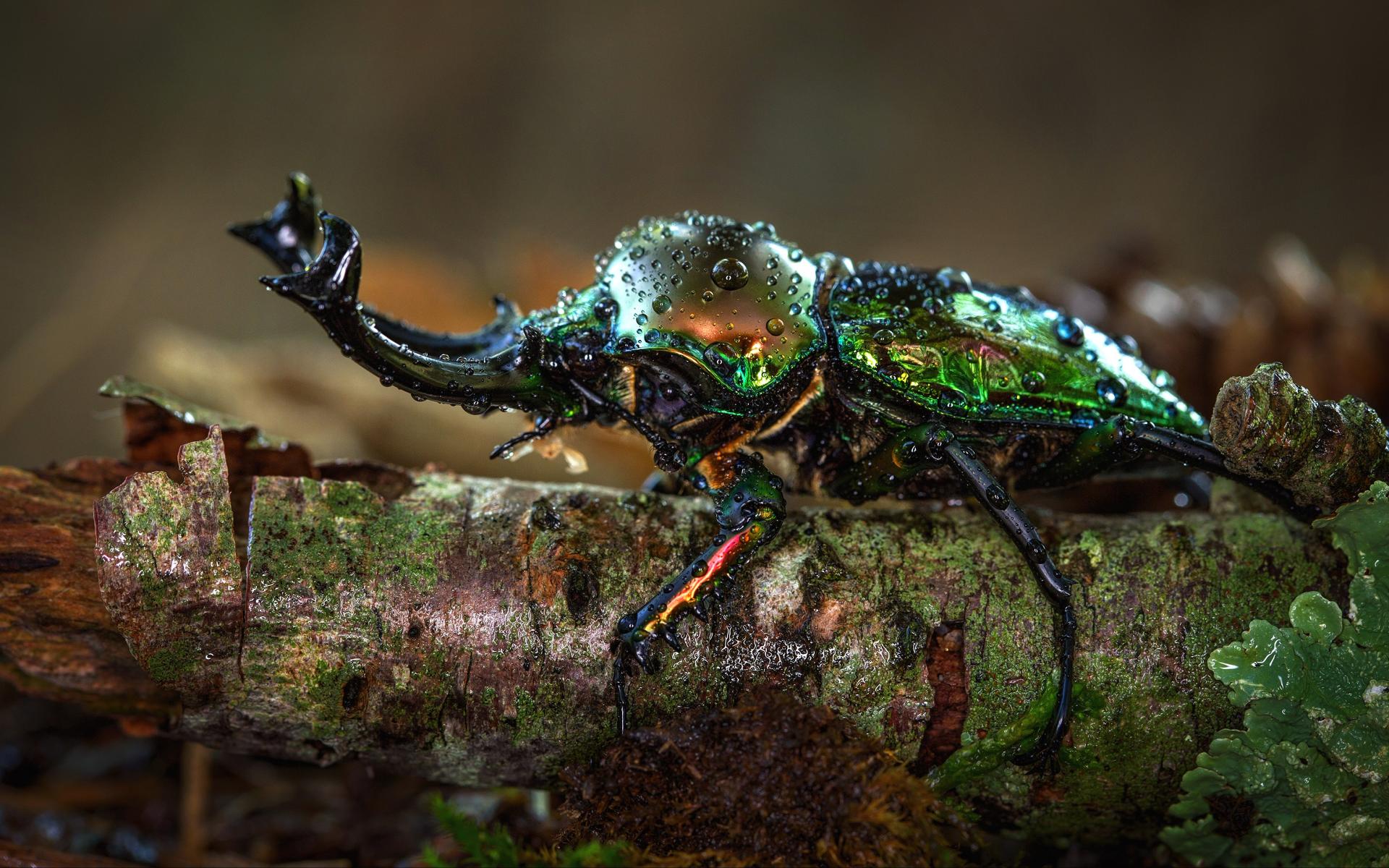 Wallpaper Beetle deer in drops of dew on a tree branch