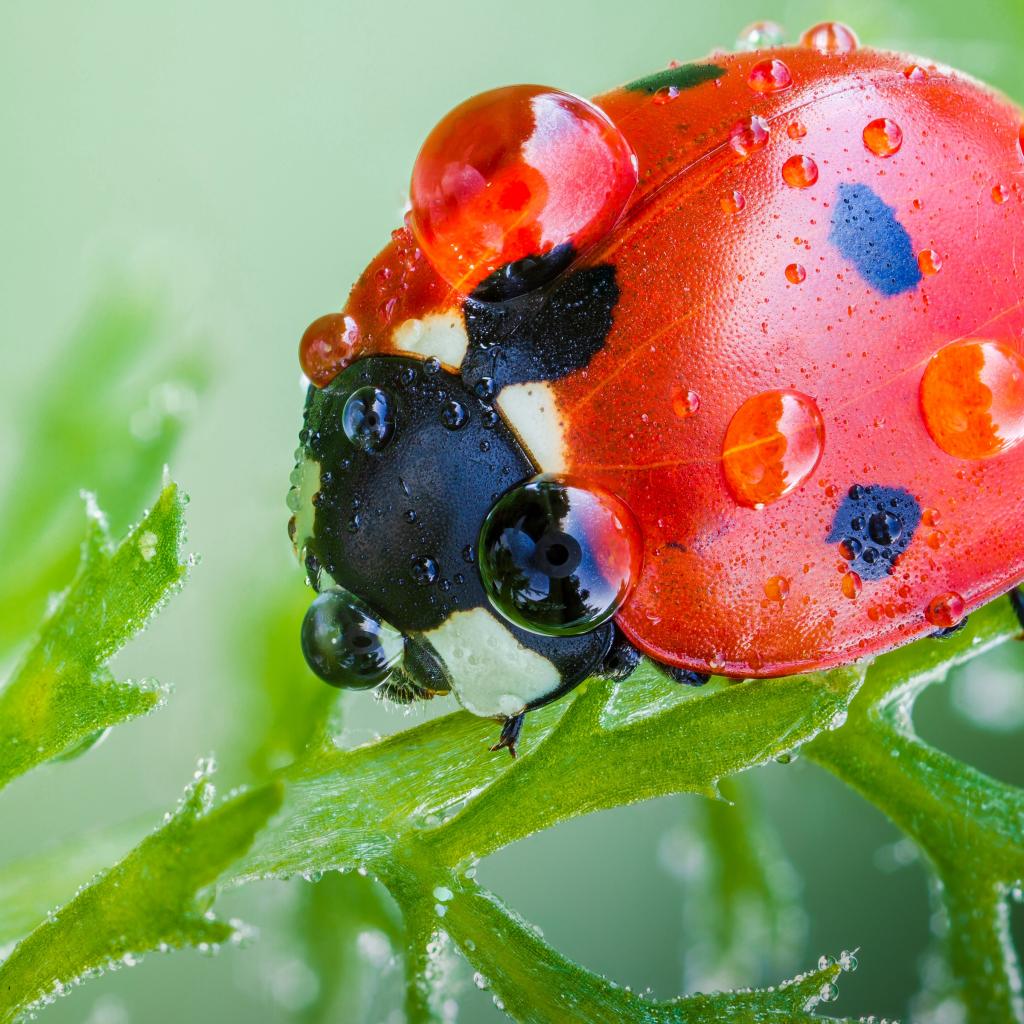 Wallpaper Red ladybug in dew drops on a green leaf macro shot