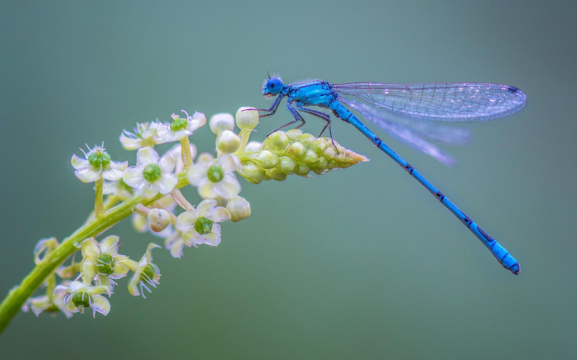 Wallpaper Blue dragonfly sits on a flower on a gray background