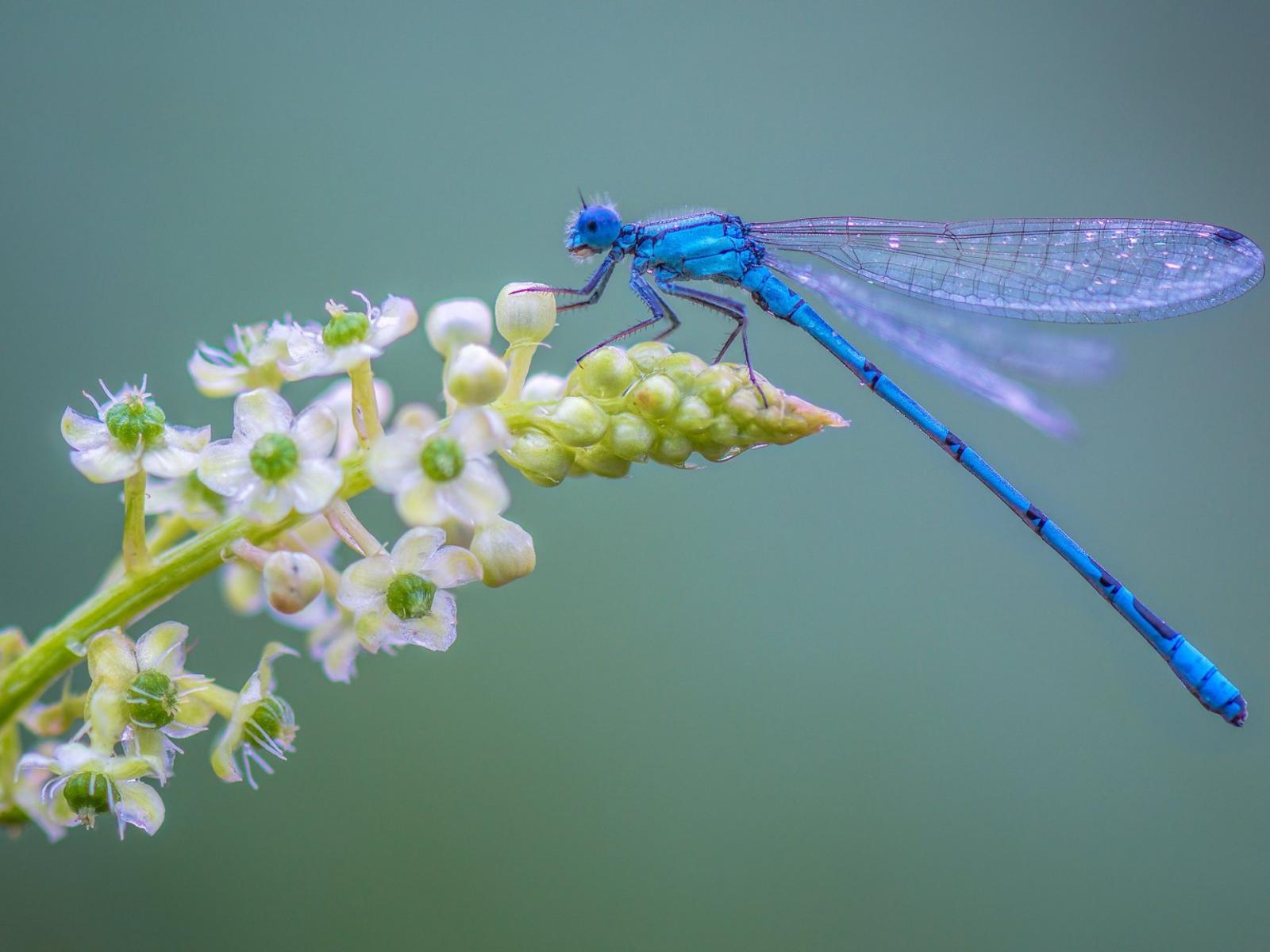 Wallpaper Blue dragonfly sits on a flower on a gray background