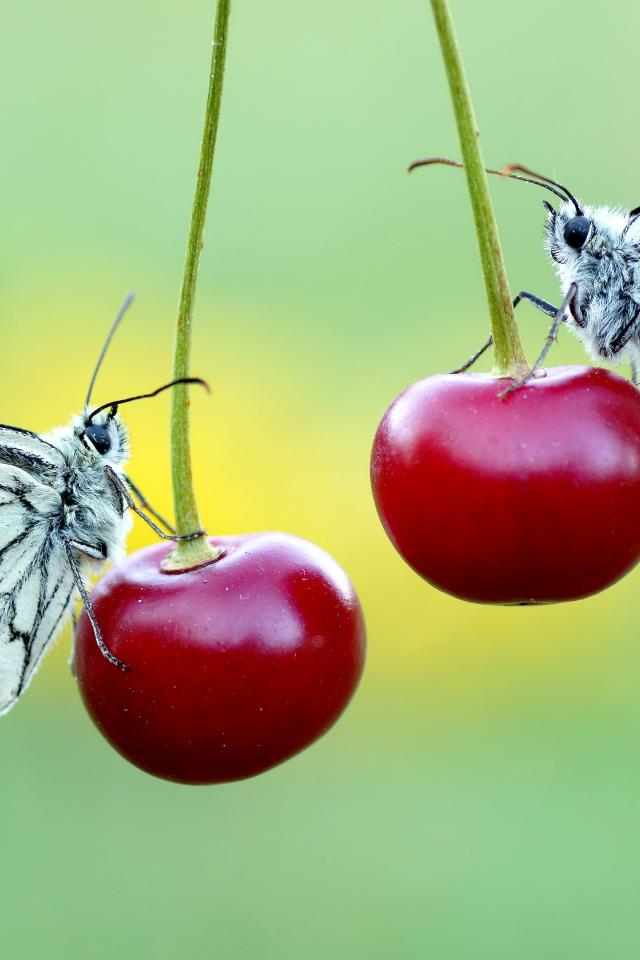 Wallpaper Two butterflies sit on red cherries