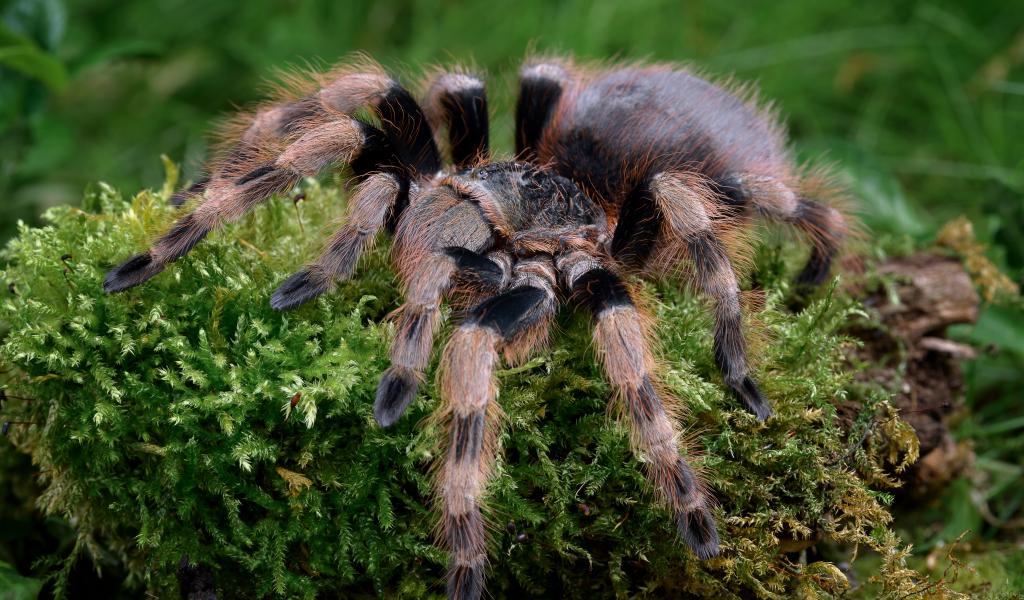 Wallpaper A large tarantula spider walks on moss-covered ground
