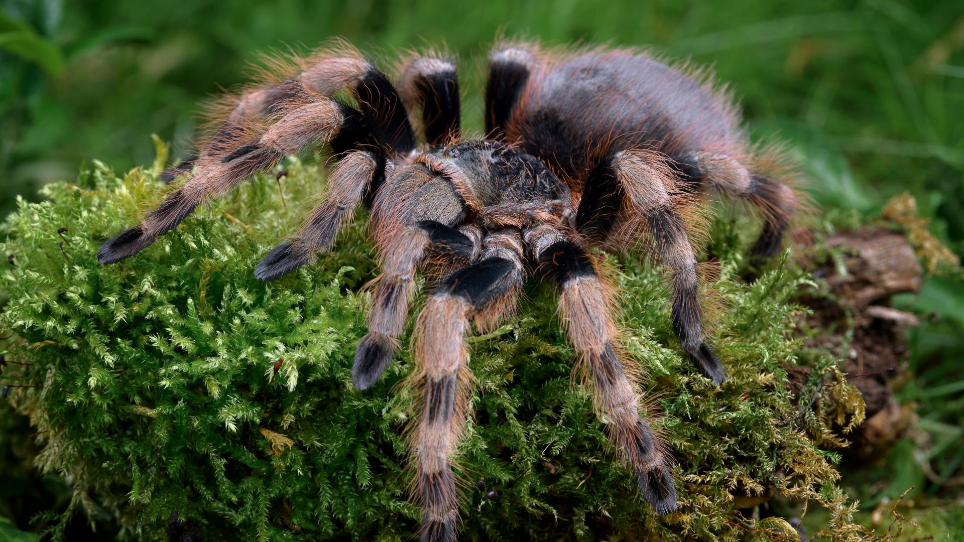Wallpaper A large tarantula spider walks on moss-covered ground