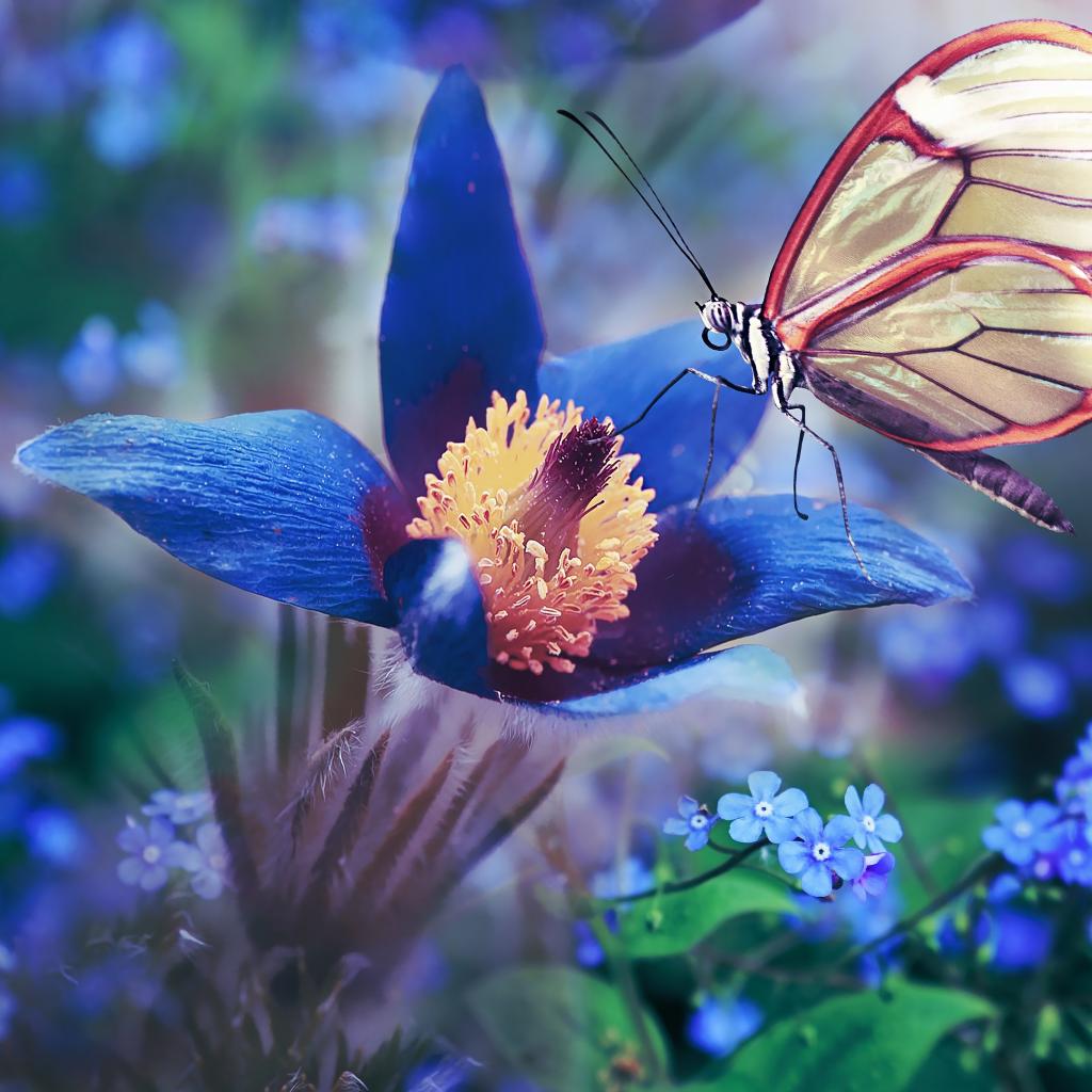 Wallpaper Beautiful butterfly sits on a blue lumbago flower