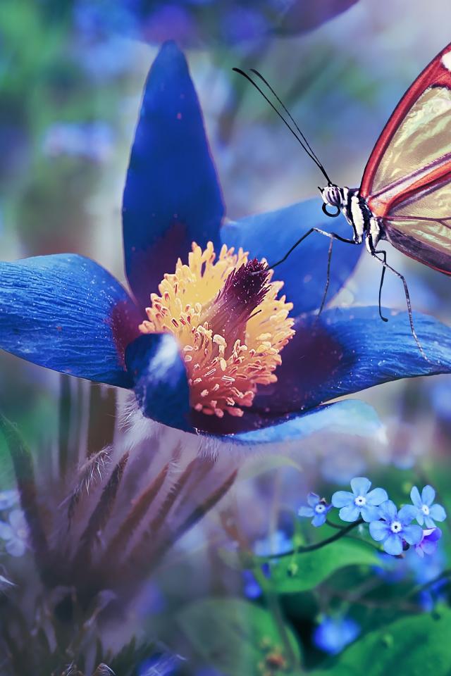 Wallpaper Beautiful butterfly sits on a blue lumbago flower