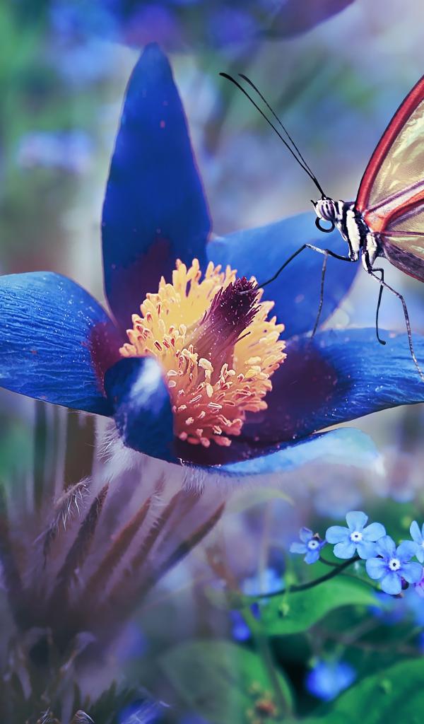 Wallpaper Beautiful butterfly sits on a blue lumbago flower