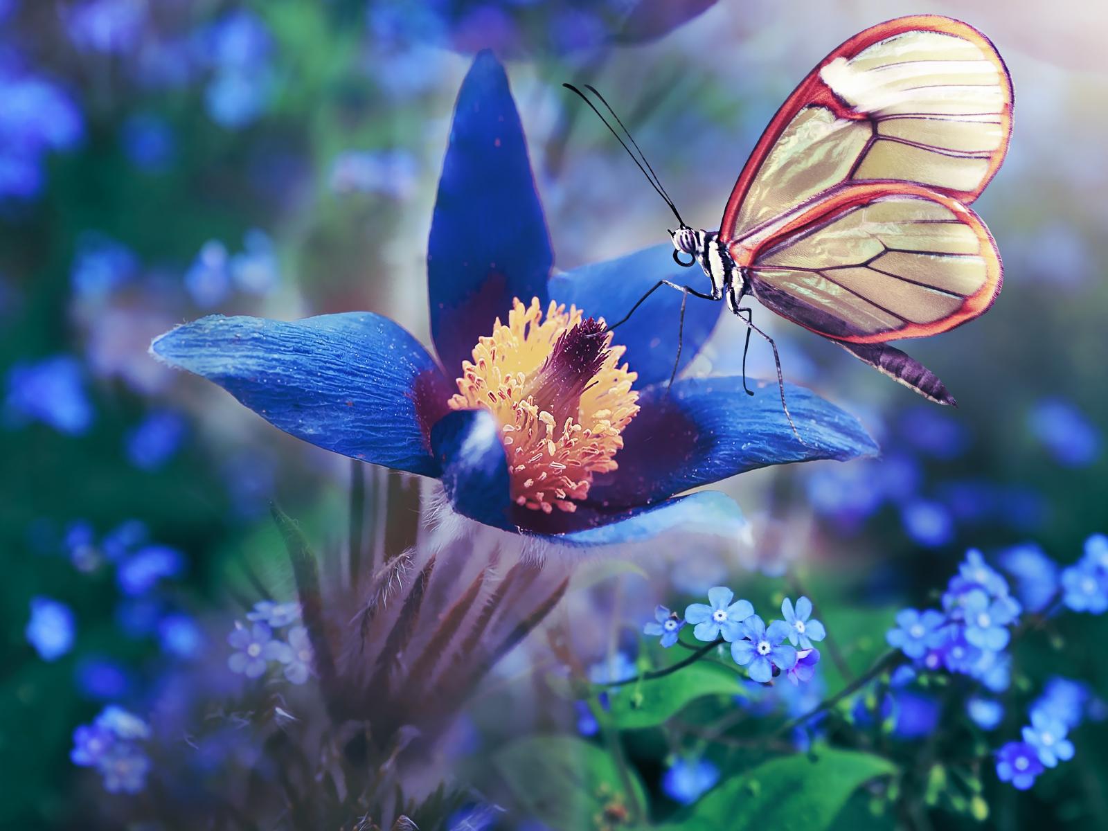 Wallpaper Beautiful butterfly sits on a blue lumbago flower