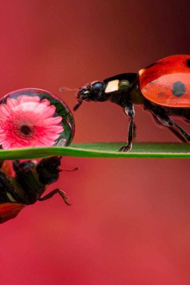 Wallpaper Two ladybugs on a green leaf with a dew drop