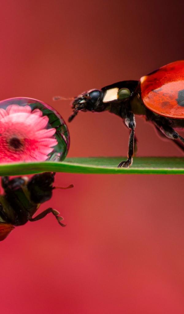 Wallpaper Two ladybugs on a green leaf with a dew drop