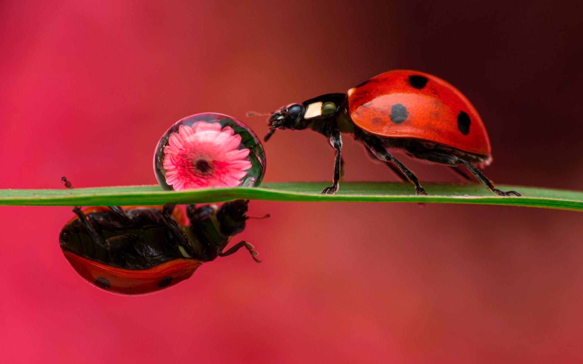Wallpaper Two ladybugs on a green leaf with a dew drop