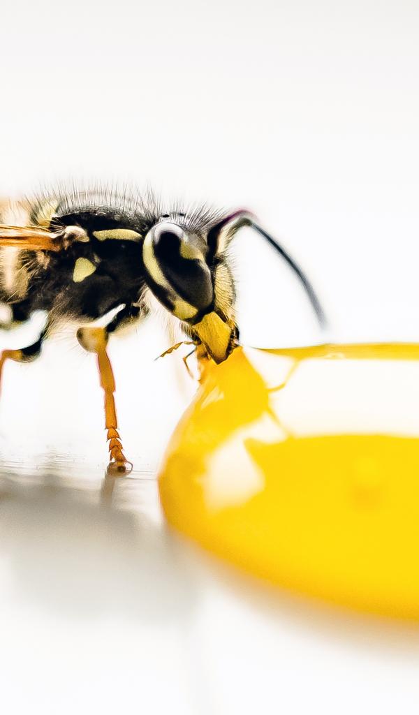 Wallpaper Big yellow wasp eating honey on a white background