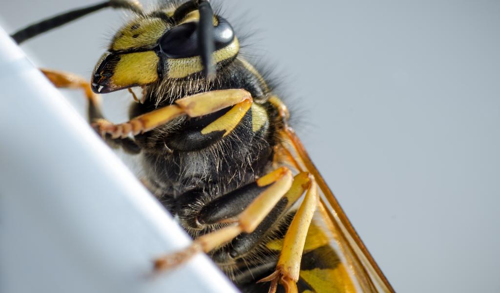Wallpaper Big bee on a gray background close up