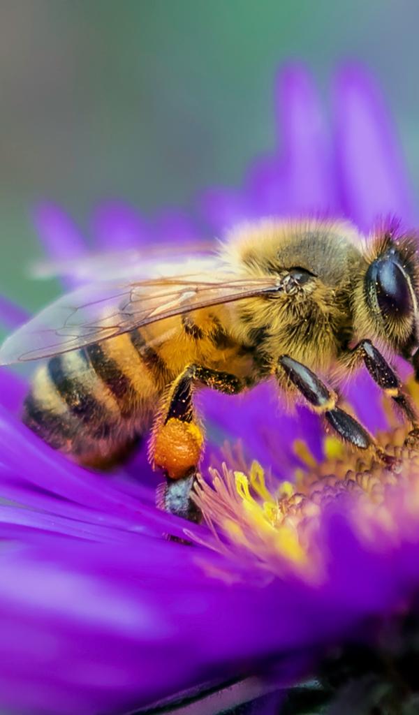 Wallpaper Bee sitting on aster flower close up