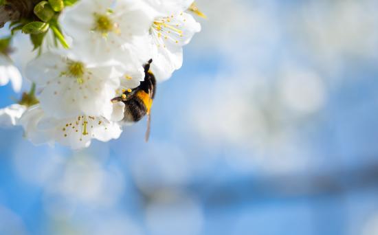 Wallpaper Bumblebee sitting on white cherry blossoms against the sky