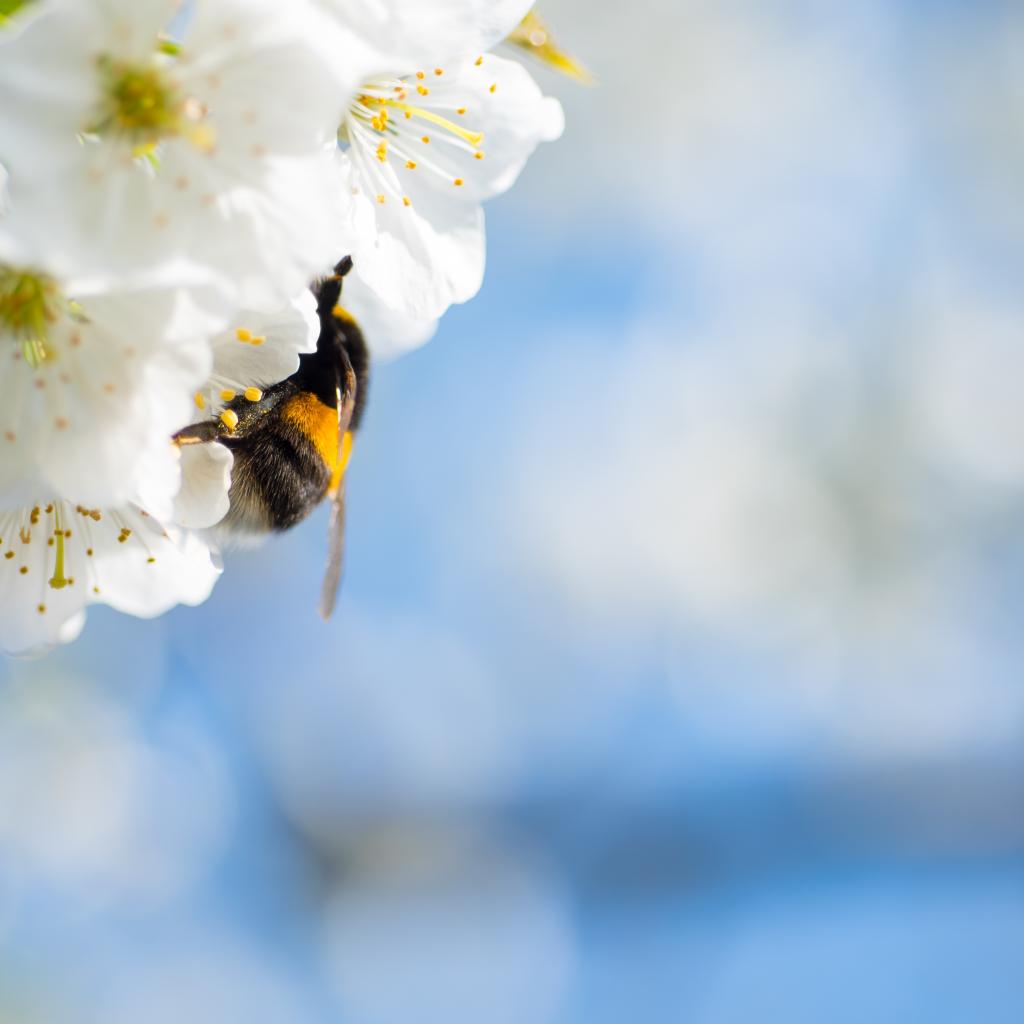 Wallpaper Bumblebee sitting on white cherry blossoms against the sky