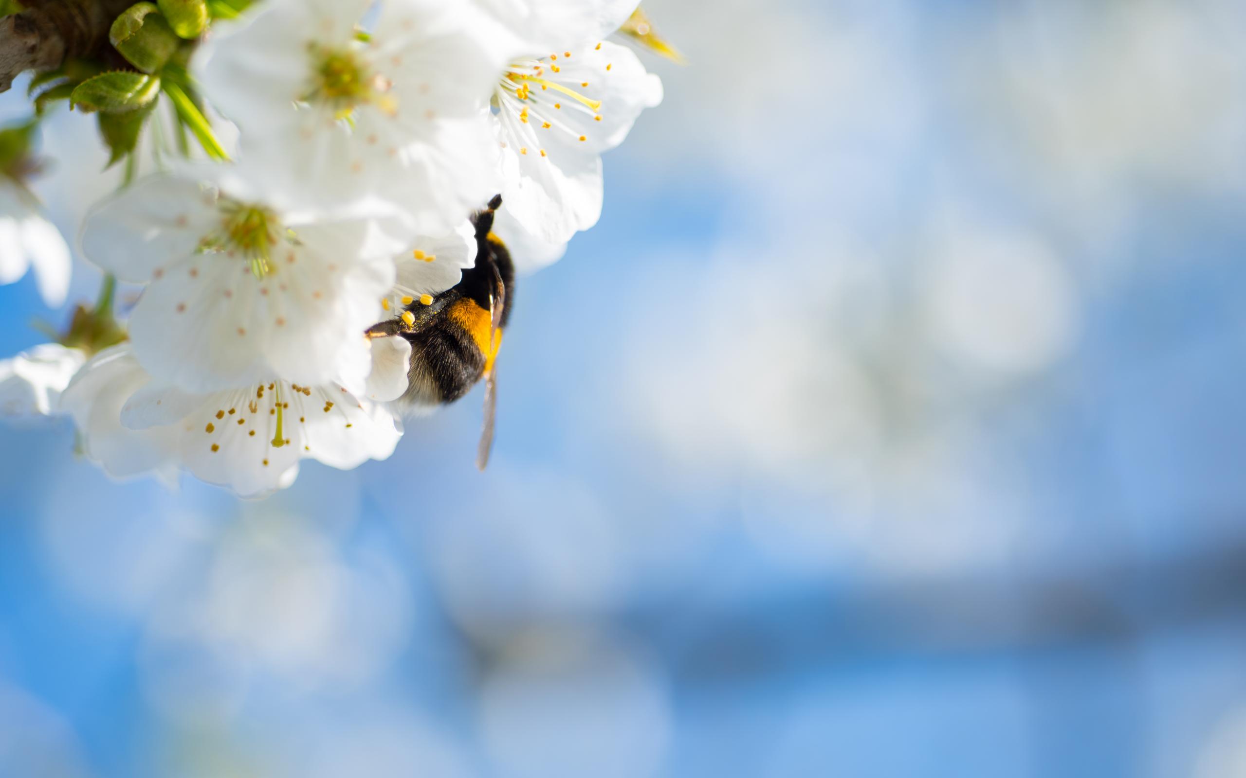 Wallpaper Bumblebee sitting on white cherry blossoms against the sky