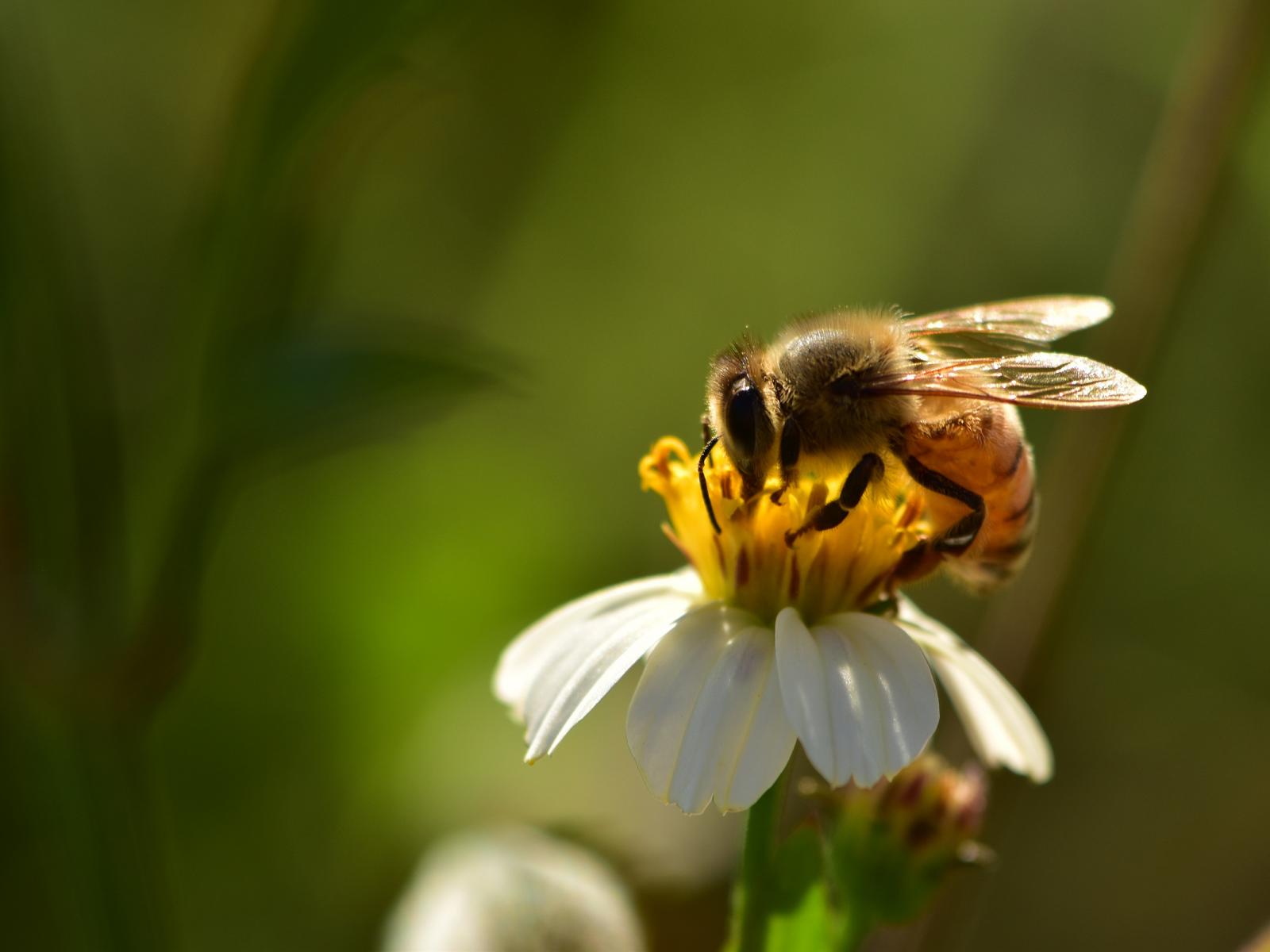 » Wallpaper Little bee on white flower close up
