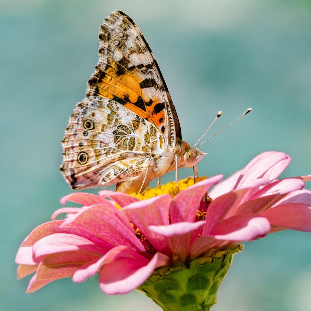 Wallpaper Butterfly sitting on pink zinnia flower close up