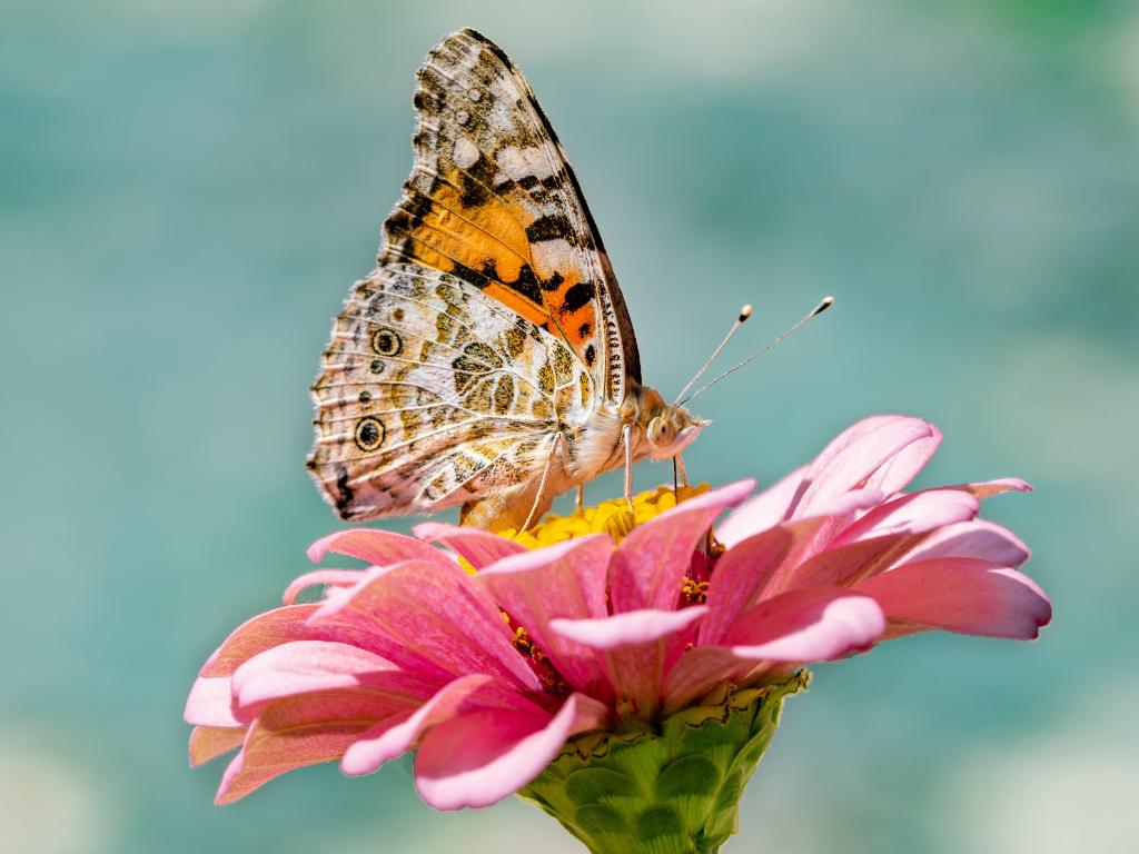 Wallpaper Butterfly sitting on pink zinnia flower close up