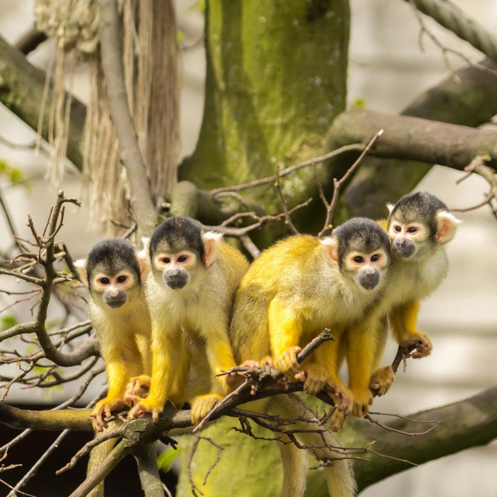 Wallpaper Four monkeys of the Simiri breed on a branch