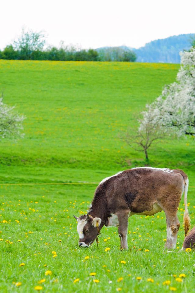 Wallpaper Cows graze on a green meadow in spring