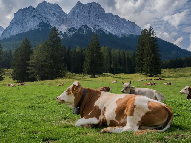Wallpaper Cows graze in an alpine meadow on a background of mountains