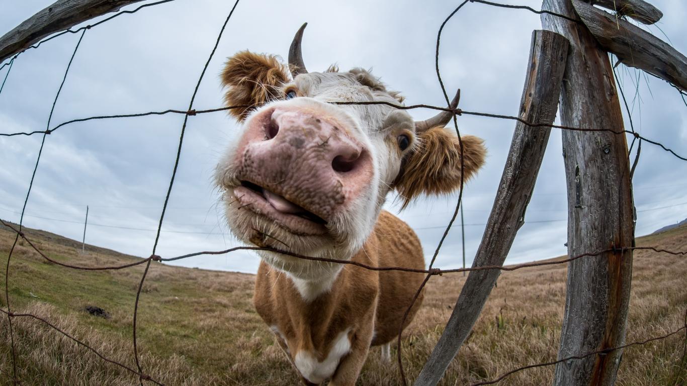 Wallpaper A cow peeks through a net at a farm