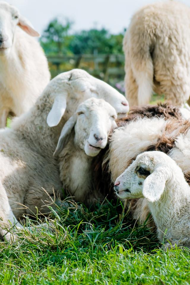 Wallpaper Domestic sheep lie on the green grass