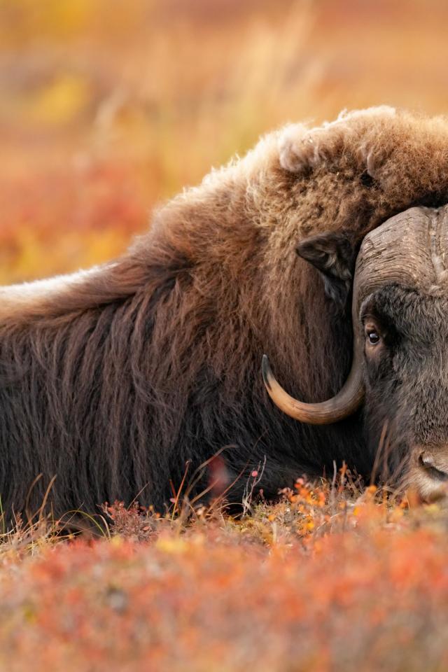 Wallpaper A large musk ox lies on the grass