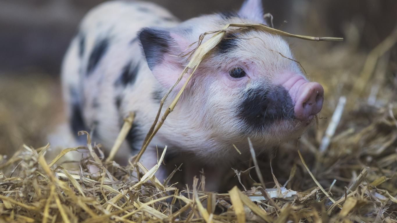 Wallpaper Little pink with black spots pig in the straw