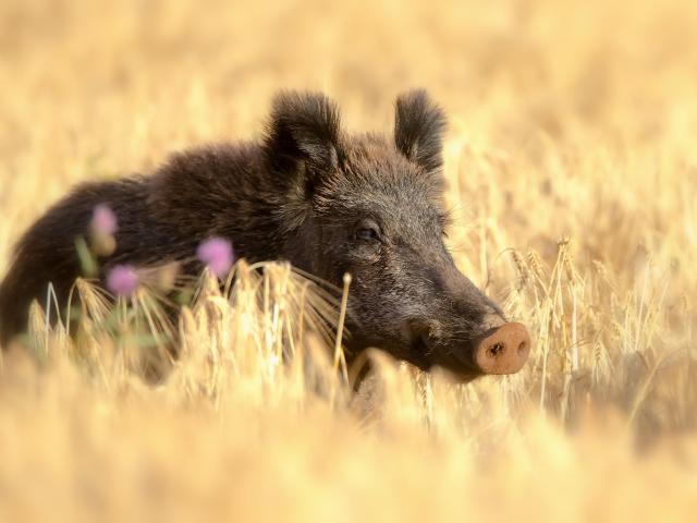Wallpaper Large wild boar in the field of yellow wheat in summer