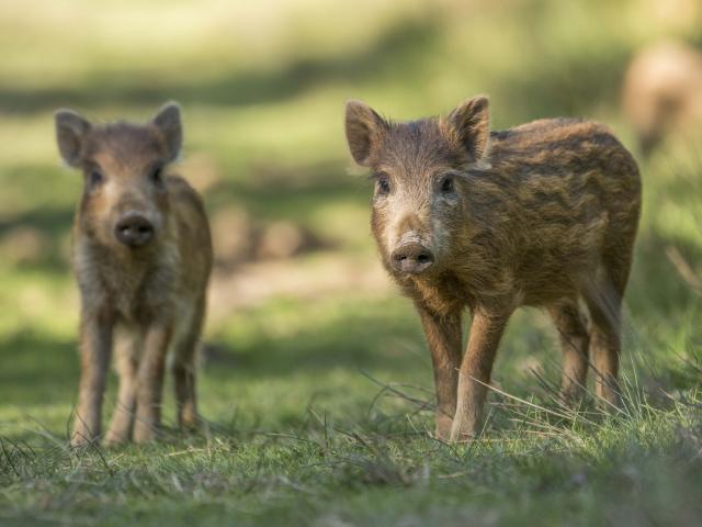 Wallpaper Two small wild pigs stand on green grass