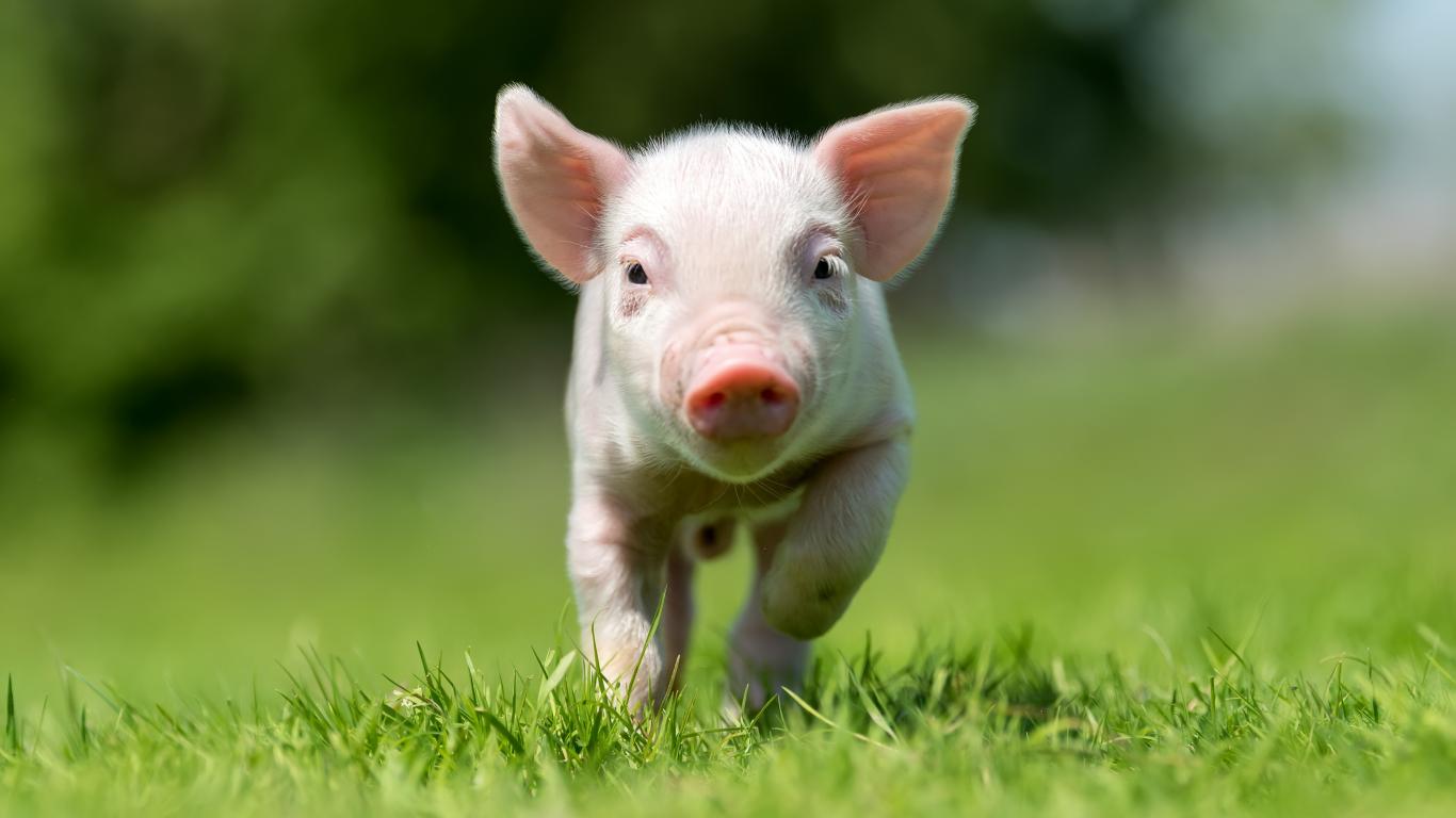Wallpaper Little pink pig running through green grass