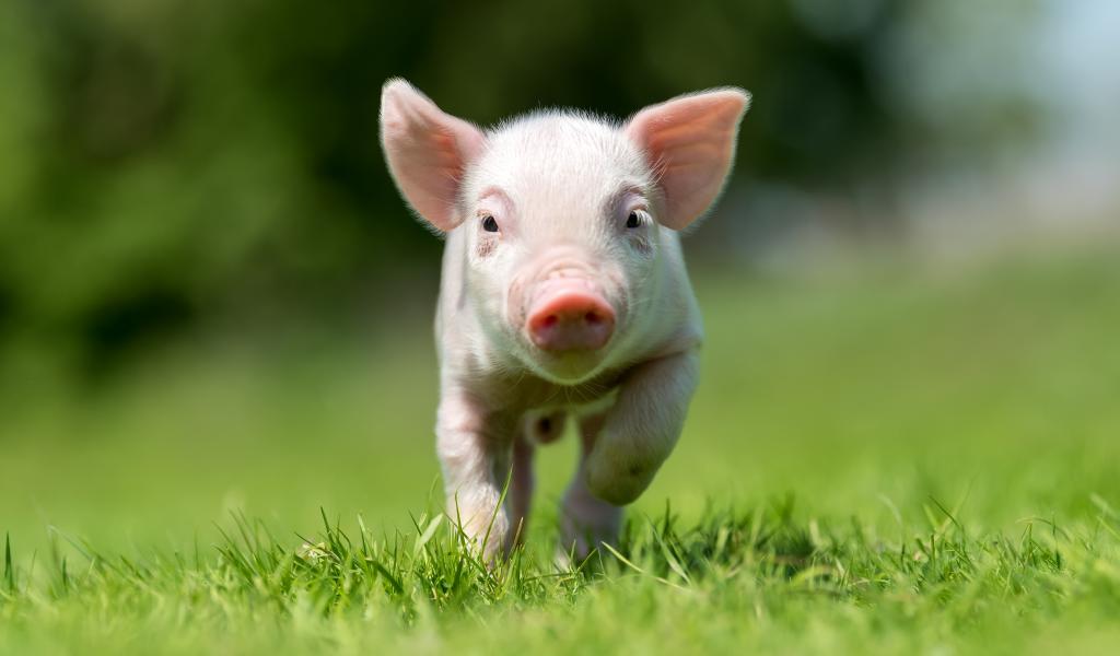 Wallpaper Little pink pig running through green grass