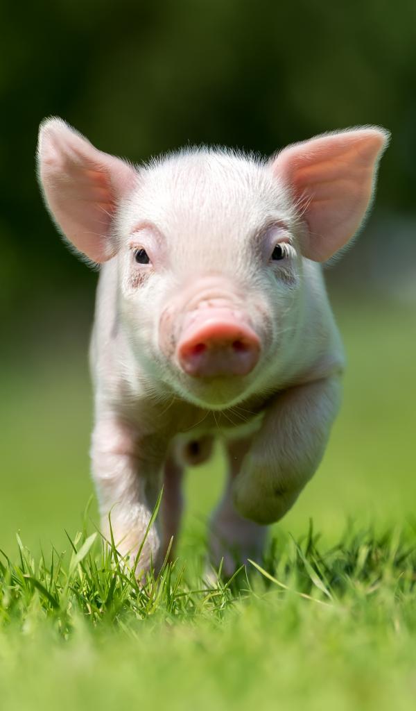 Wallpaper Little pink pig running through green grass