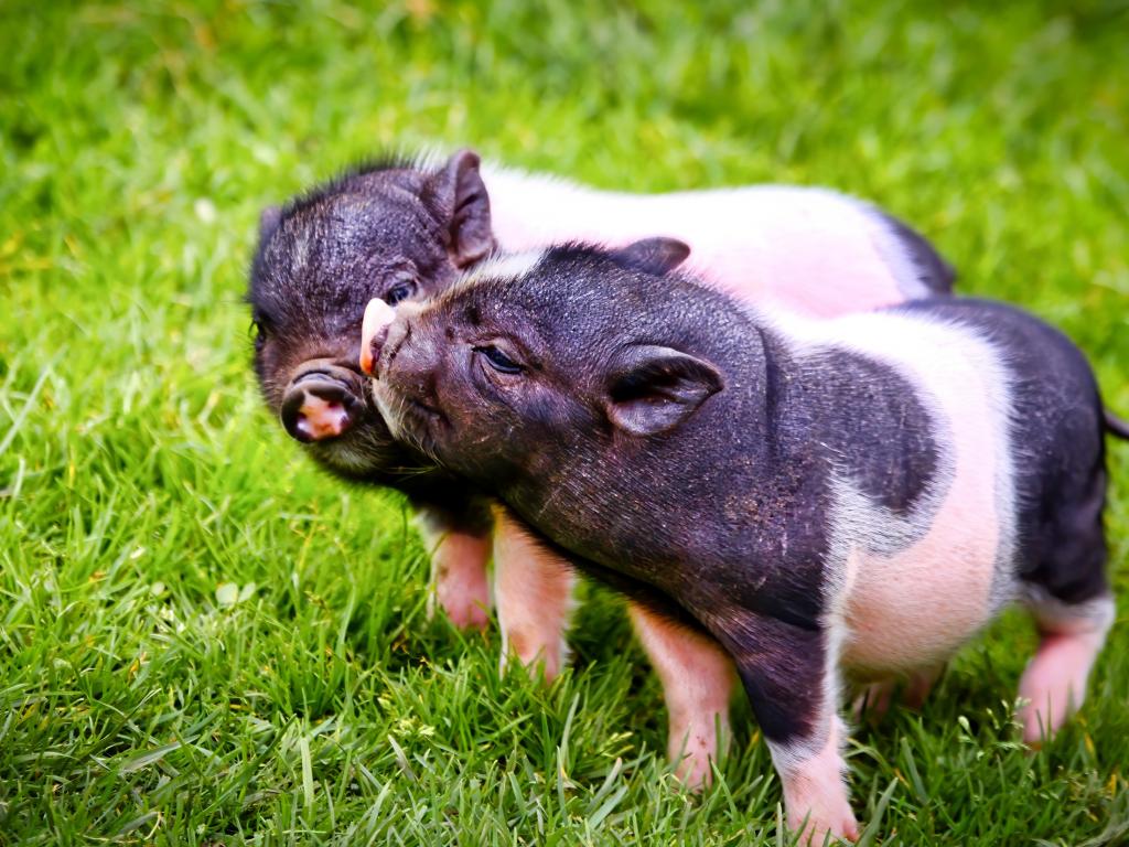 Wallpaper Two cute pigs on the green grass.