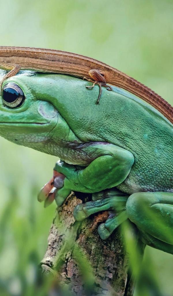 Wallpaper Lizard sitting on a big green frog