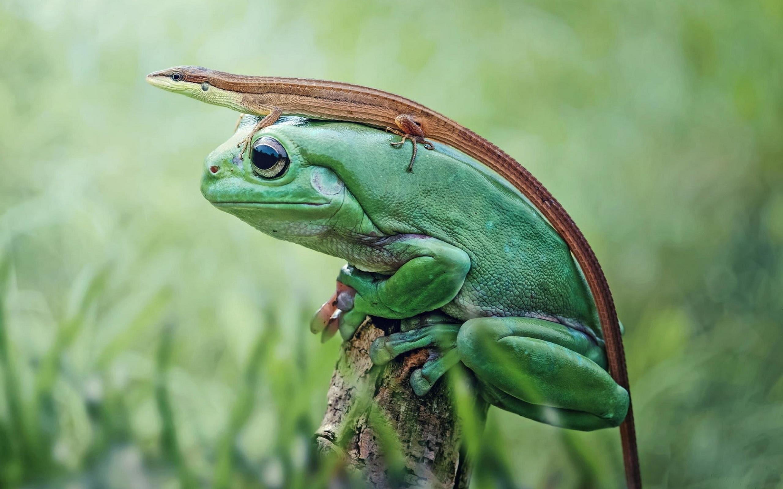 Wallpaper Lizard sitting on a big green frog