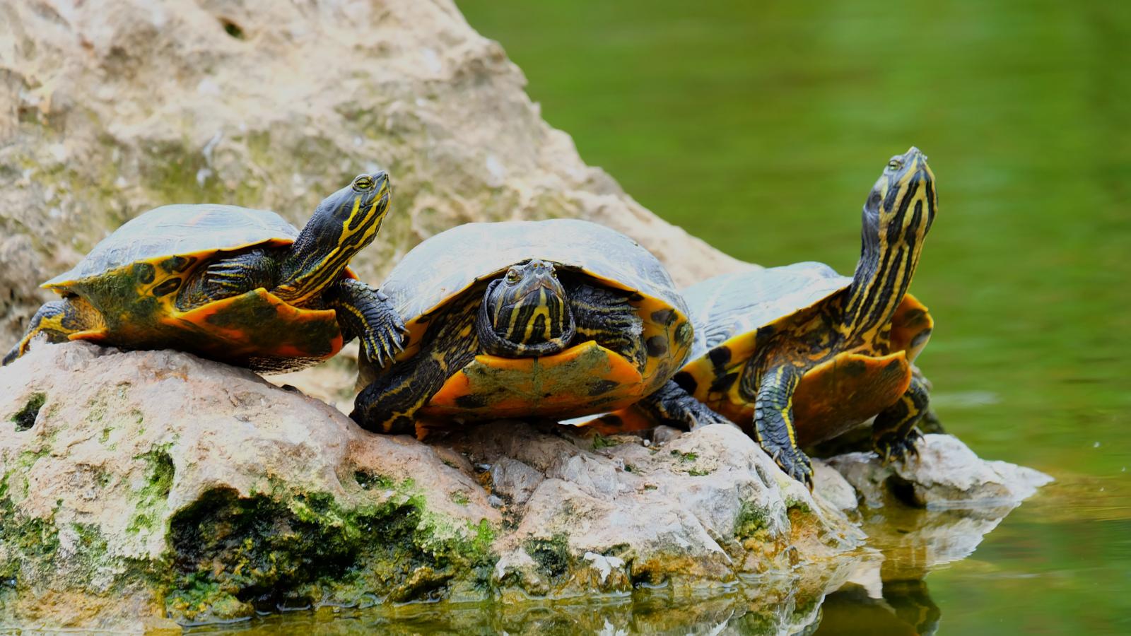 Wallpaper Three turtles on a stone by the pond