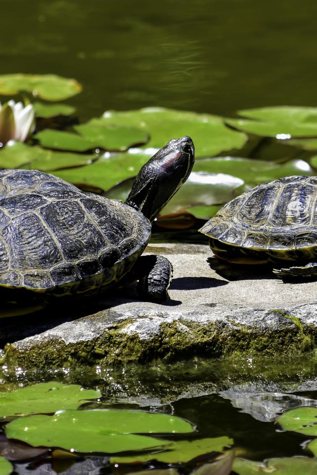 Wallpaper Two turtles sit on a rock in a pond