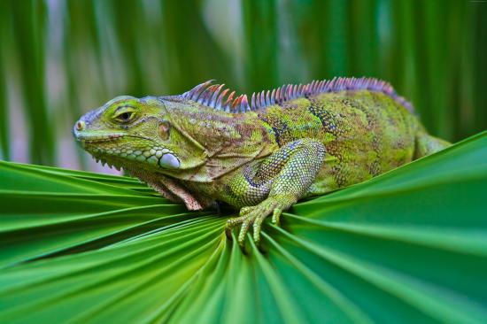 Wallpaper Beautiful green iguana sits on a green leaf