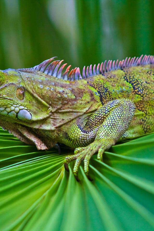Wallpaper Beautiful green iguana sits on a green leaf