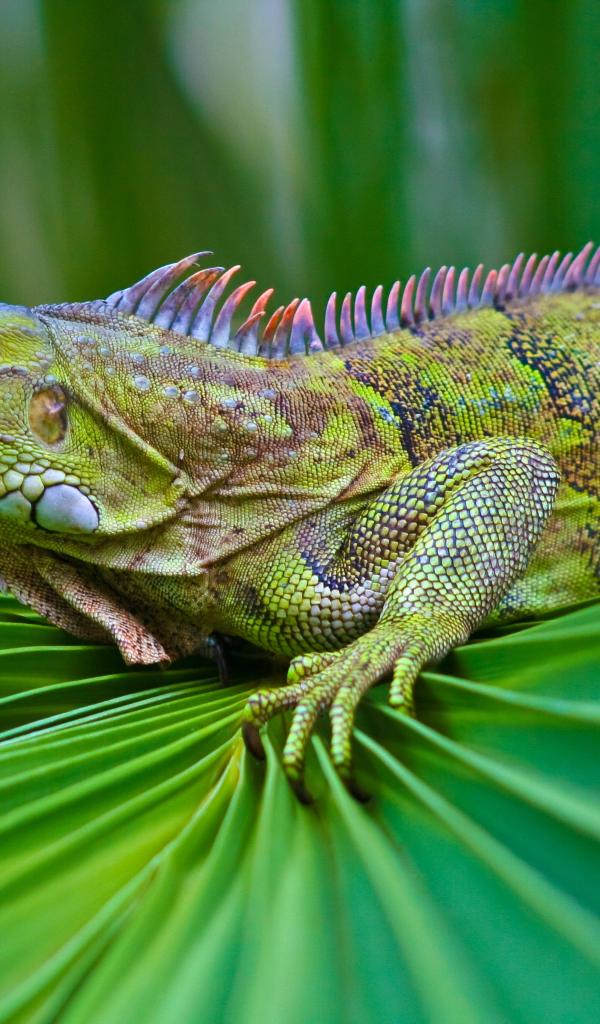 Wallpaper Beautiful green iguana sits on a green leaf
