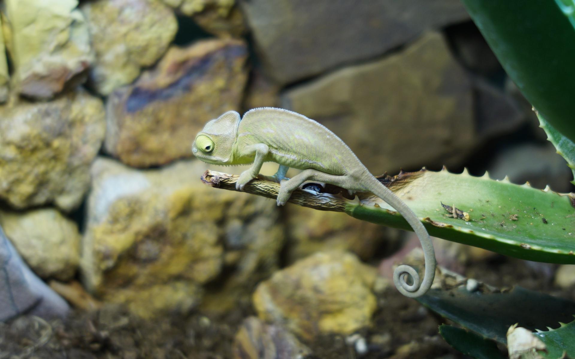 Wallpaper Green chameleon sitting on aloe branch